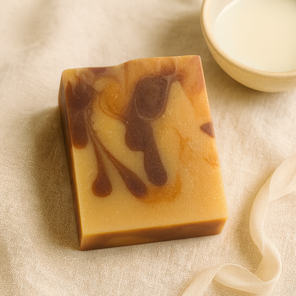 Warm, grounding, and beautifully aromatic — this handcrafted soap brings together the bright citrus lift of pure orange essential oil and the earthy depth of patchouli for a scent that’s both energizing and serene. Fresh goat milk enriches each bar with a creamy, soothing lather, while shea butter and grapeseed oil provide deep nourishment. A touch of tussah silk adds luxurious glide, and natural colorants like annatto seed and cocoa powder lend a warm, rustic beauty to every batch.